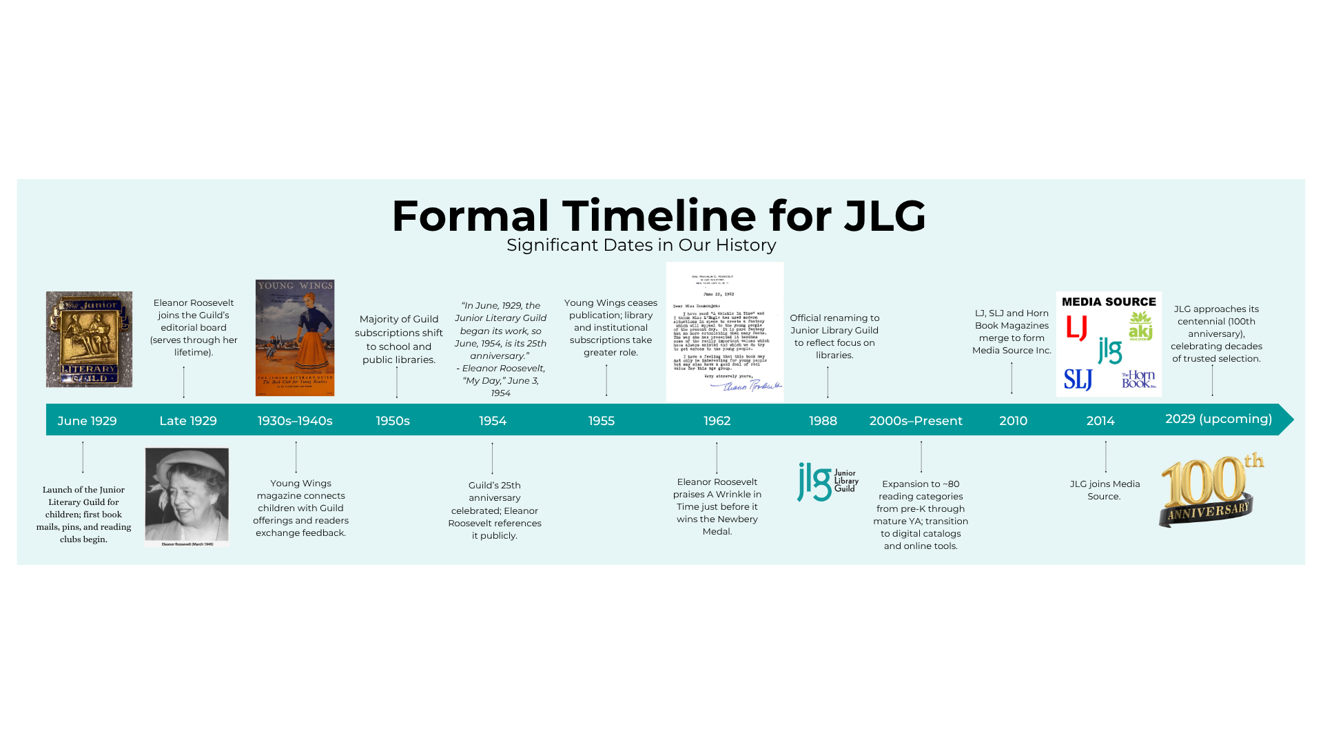 For nearly a century, Junior Library Guild has helped libraries put extraordinary books into young readers’ hands. We began in 1929 as the Junior Literary Guild, a children’s companion to an adult book club. In those early days, young members received books at home, wore Guild pins, and followed along with our magazine, Young Wings.